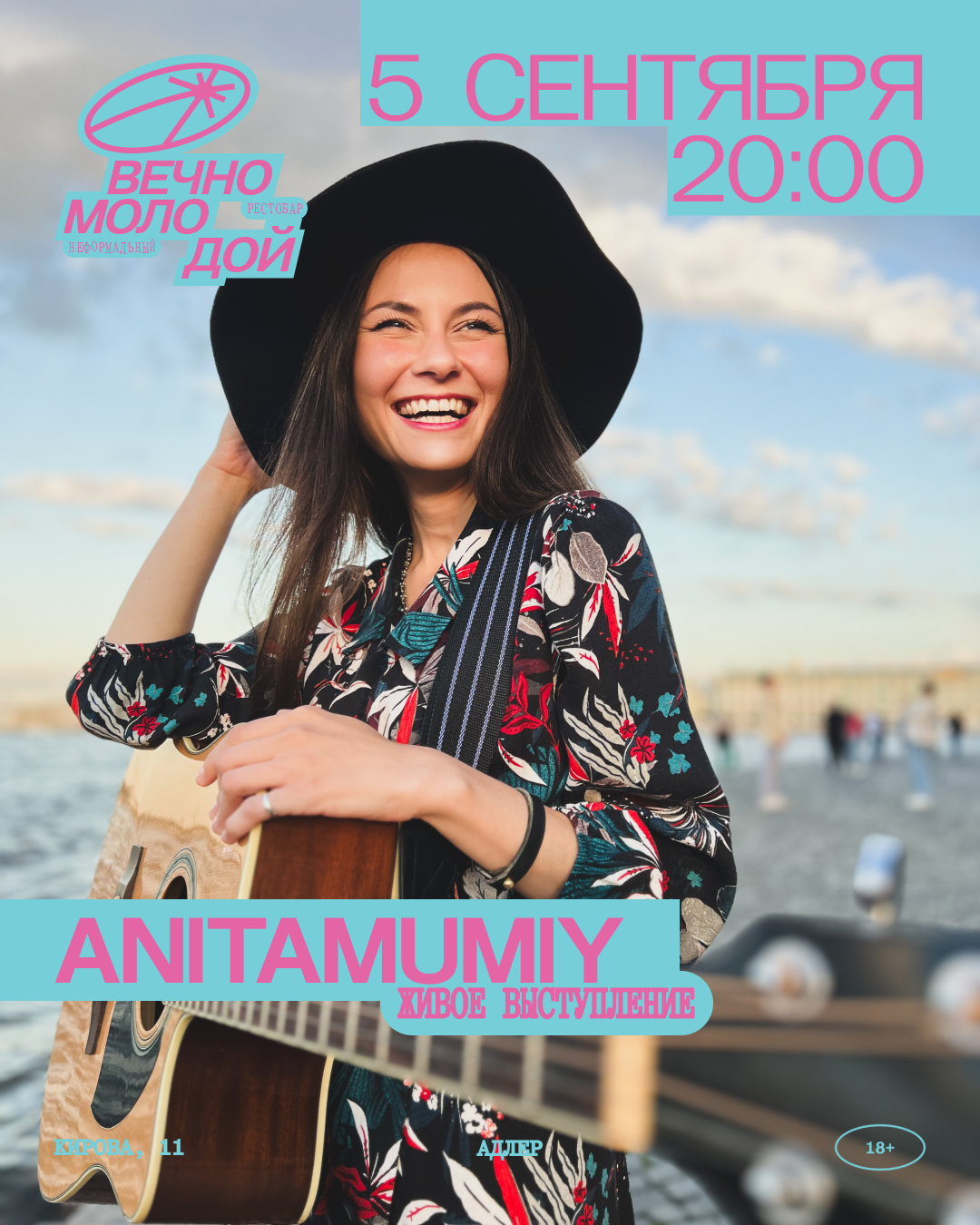 5 сентября живое выступление ANITAMUMIY Музыка с душой Петербурга! Хиты на гитаре с лёгкой перкуссией, создающейся прямо на ваших глазах!