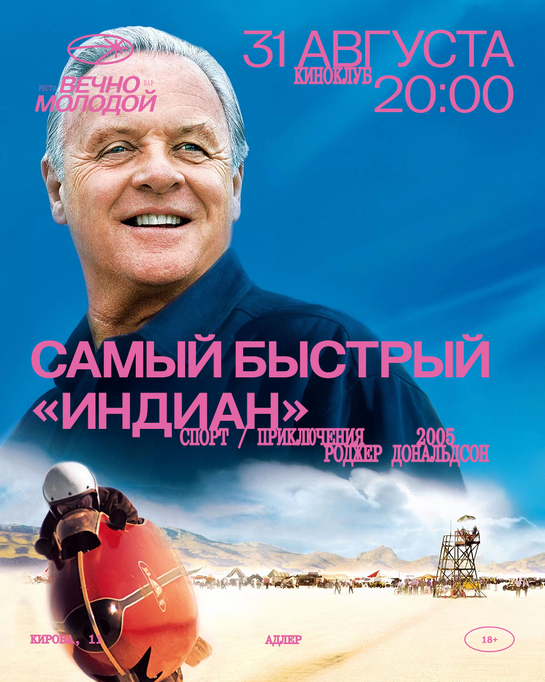 На экране бара фильм «Самый быстрый Индиан». Роджер Дональдсон, 2005г, спорт / приключения